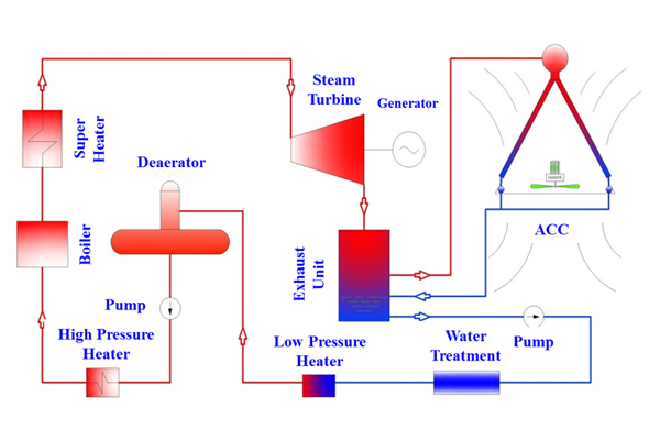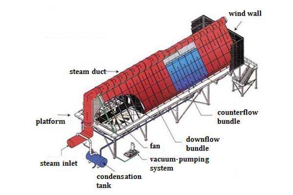 A type of condensing equipment that employs ambient air as cooling medium to directly condense the turbine exhaust steam into water by air cooled bundles.